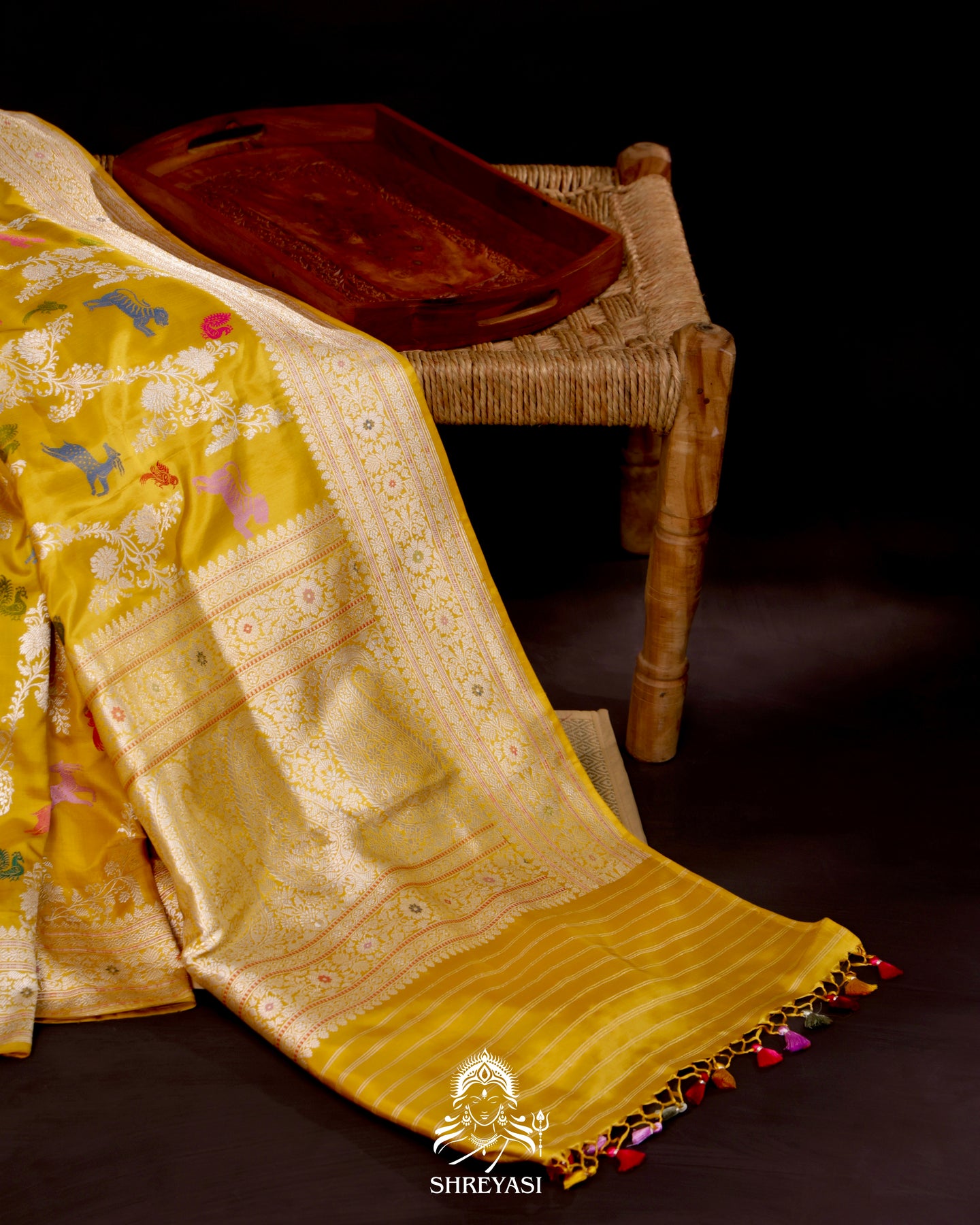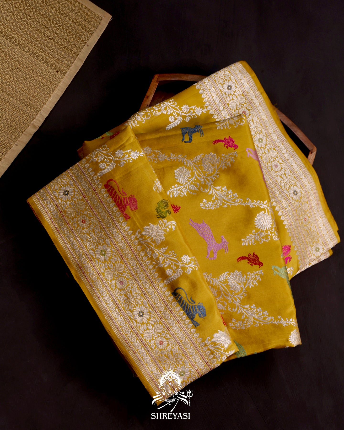 Banarasi Ektara silk saree in marigold yellow with kadhwa meenakari animal motifs and full zari border