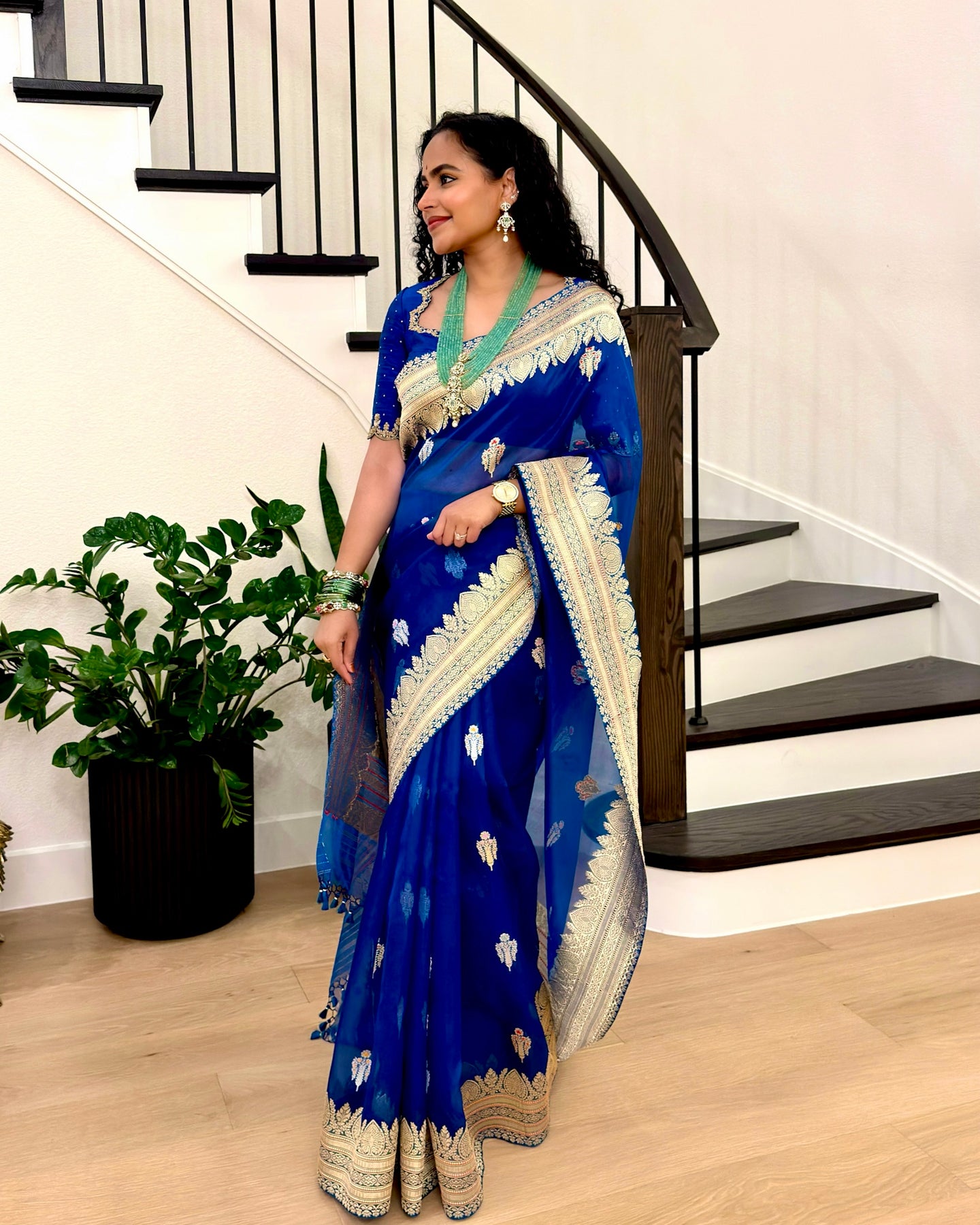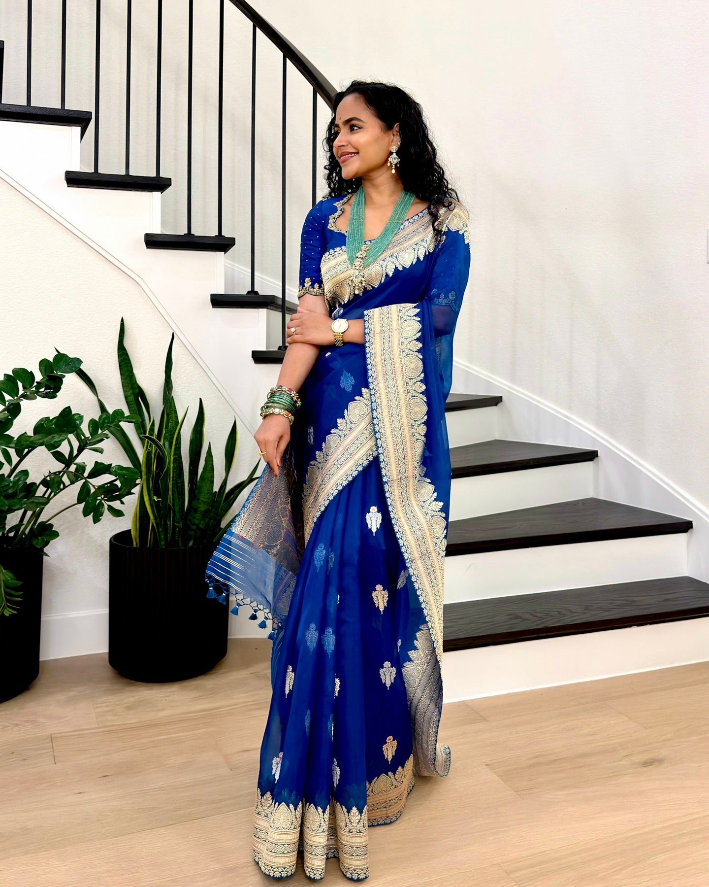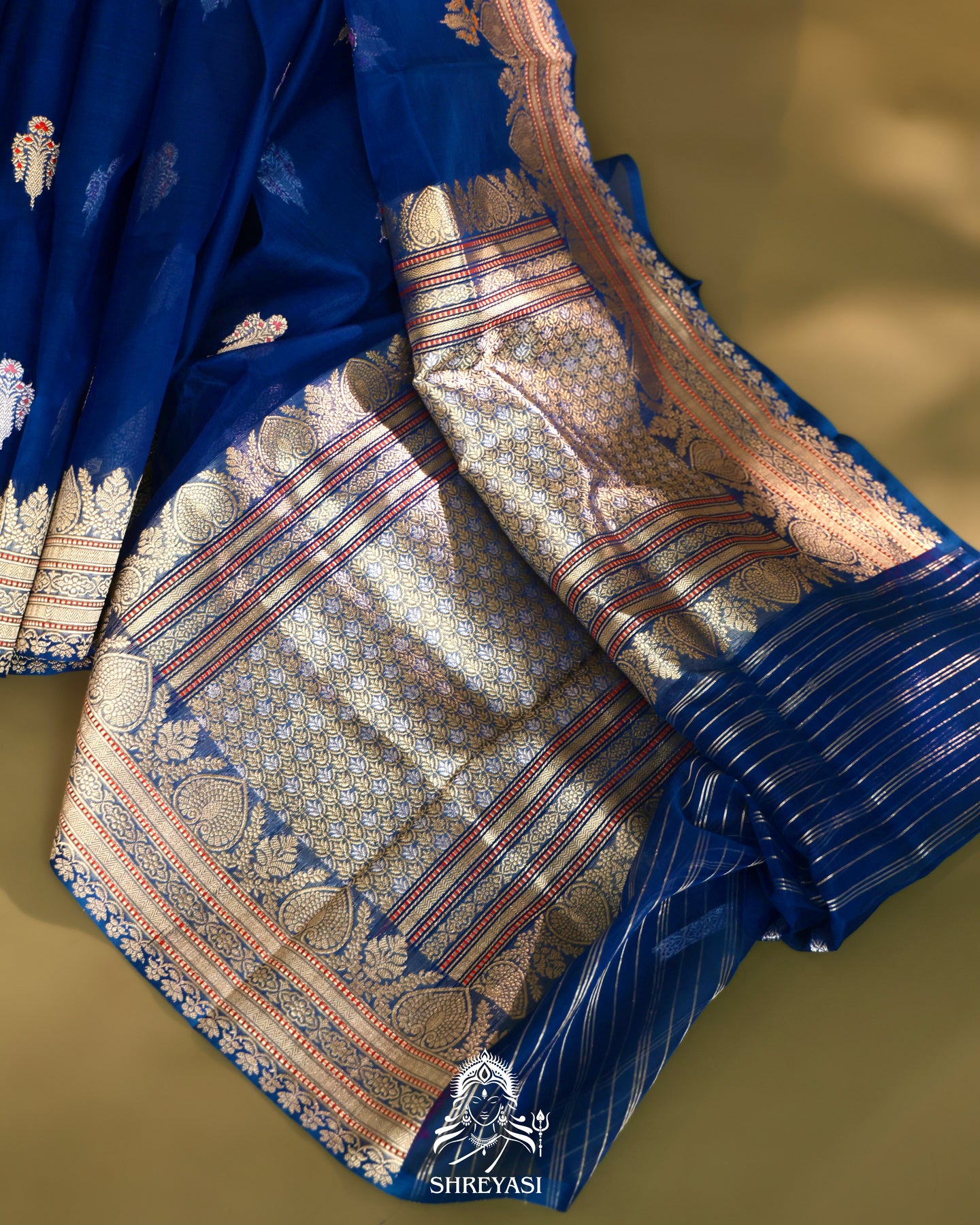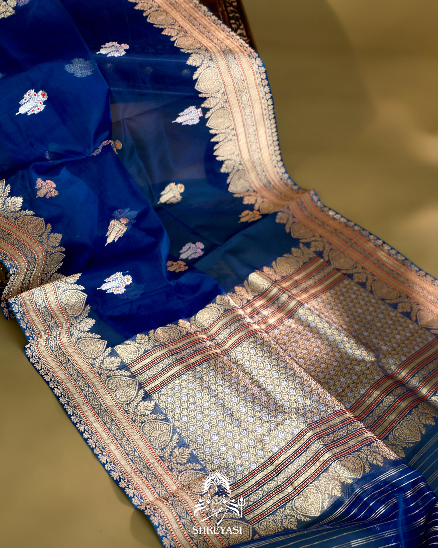 Set on a royal blue base, the saree balances intensity with refinement, offering a surface that feels powerful yet composed, expressive yet controlled.