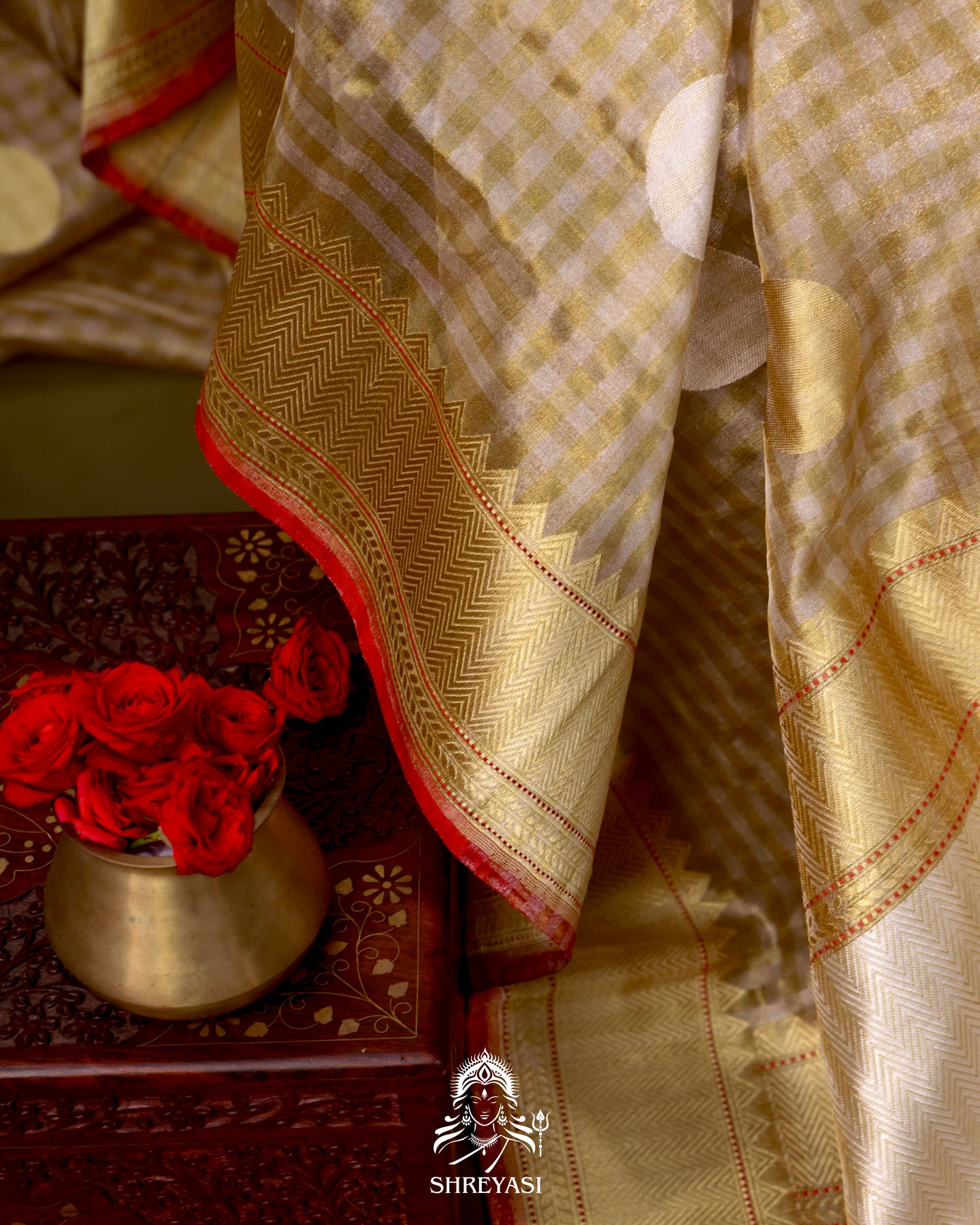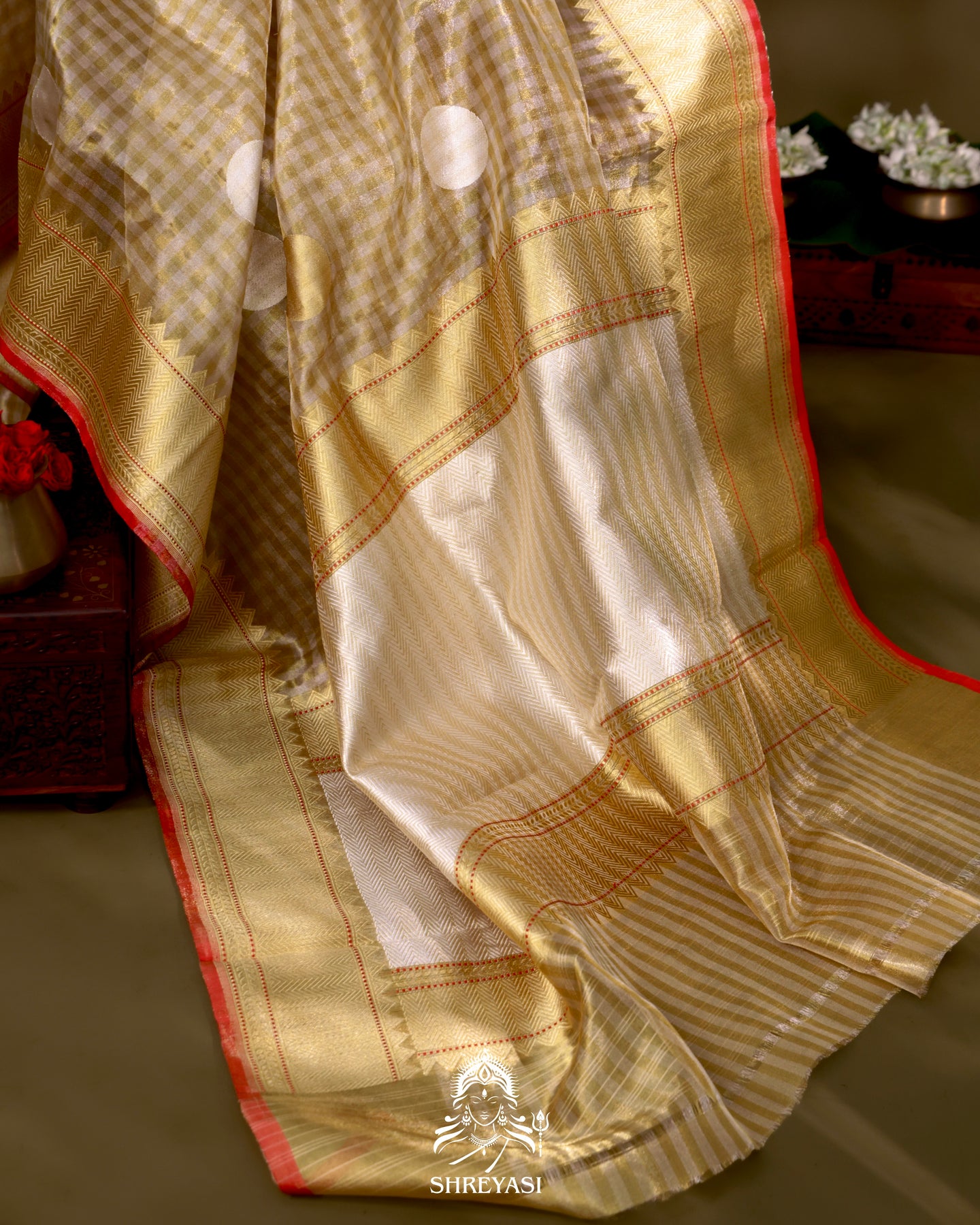 The body features a fine zari infused check pattern, almost like a delicate gingham grid, lending subtle structure beneath the shimmer. Large circular polka motifs in gold and ivory sit confidently across the surface, spaced with intention.