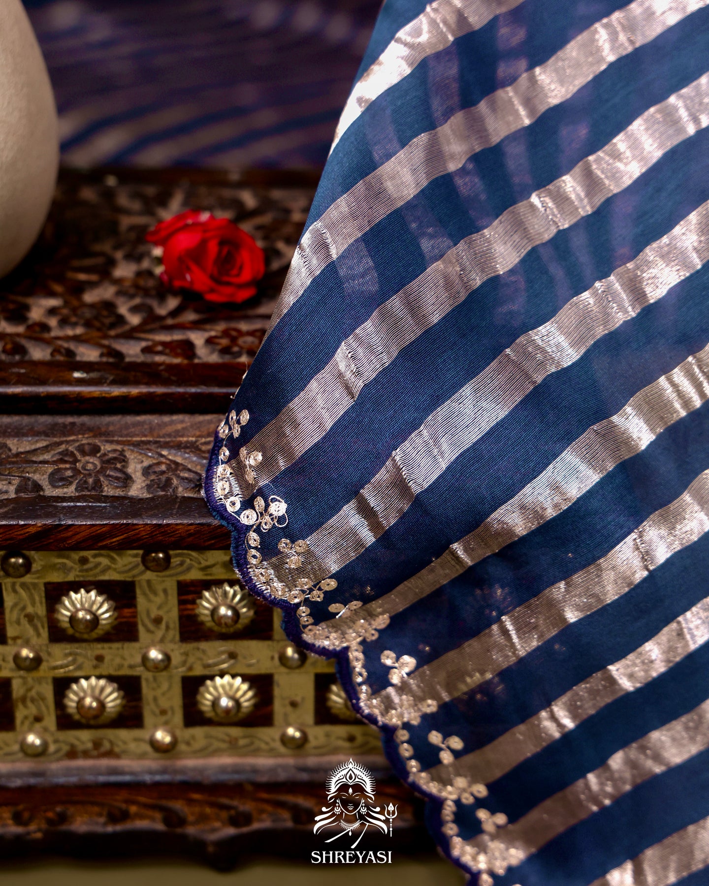 The highlight is the statement blouse. A rich navy base adorned with oversized floral motifs and detailed pita embroidery, designed to stand out in contrast to the linear rhythm of the saree. The blouse elevates the entire ensemble, turning a minimal drape into a striking composition.