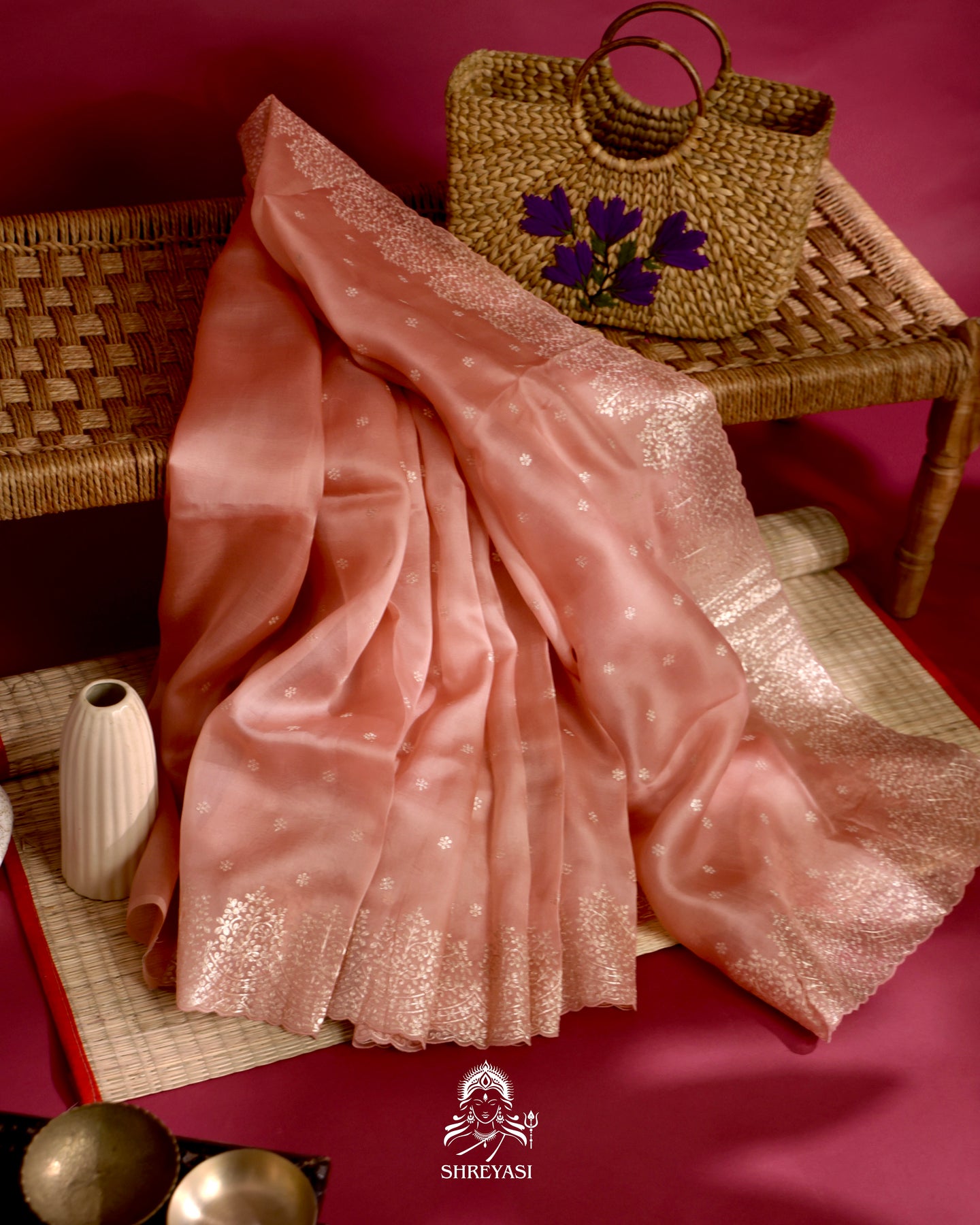A pure organza silk saree with a sheer, fluid base and a soft, luminous finish. Fine pitta embroidery is worked across the borders and body, creating a delicate embossed shimmer that catches light without overwhelming the transparency of the fabric.
