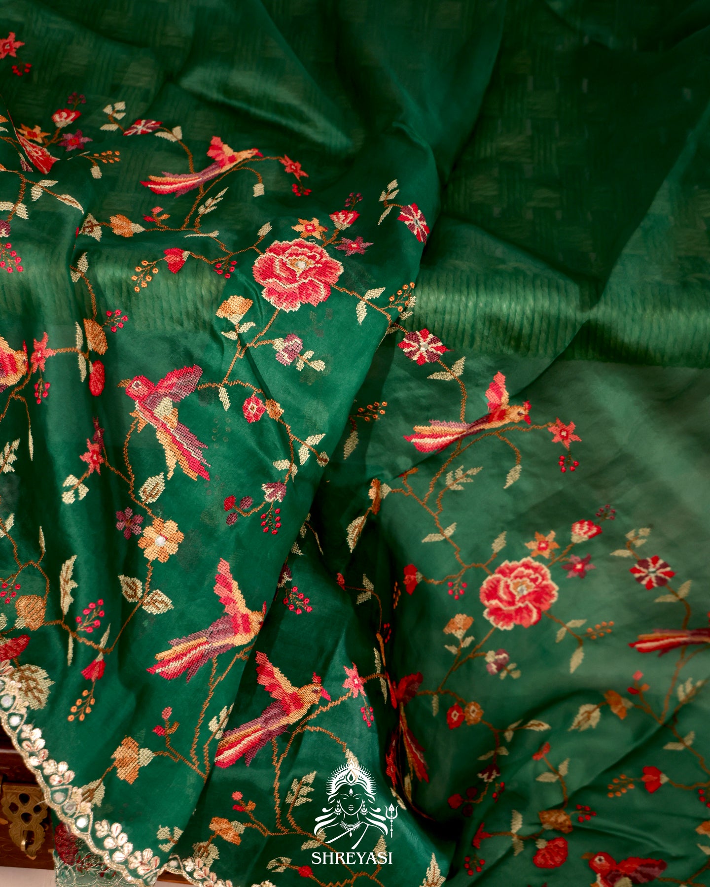 Despite the detailed embroidery, the saree retains the natural crisp drape and airy quality characteristic of pure organza silk. The overall look is elegant, light, and visually balanced.