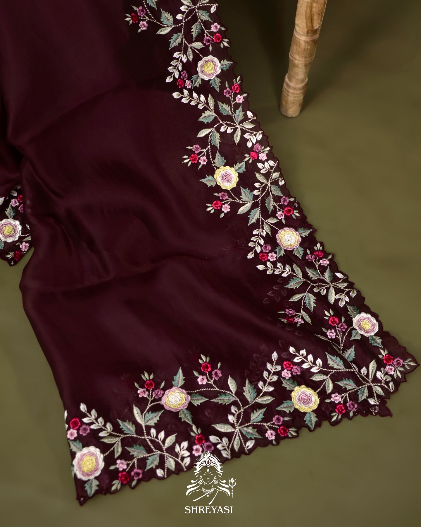 This pure organza silk saree unfolds in a rich wine hue, sheer yet structured with the crisp fall that defines true organza. The body remains intentionally restrained, allowing the embroidered borders and pallu to take focus.