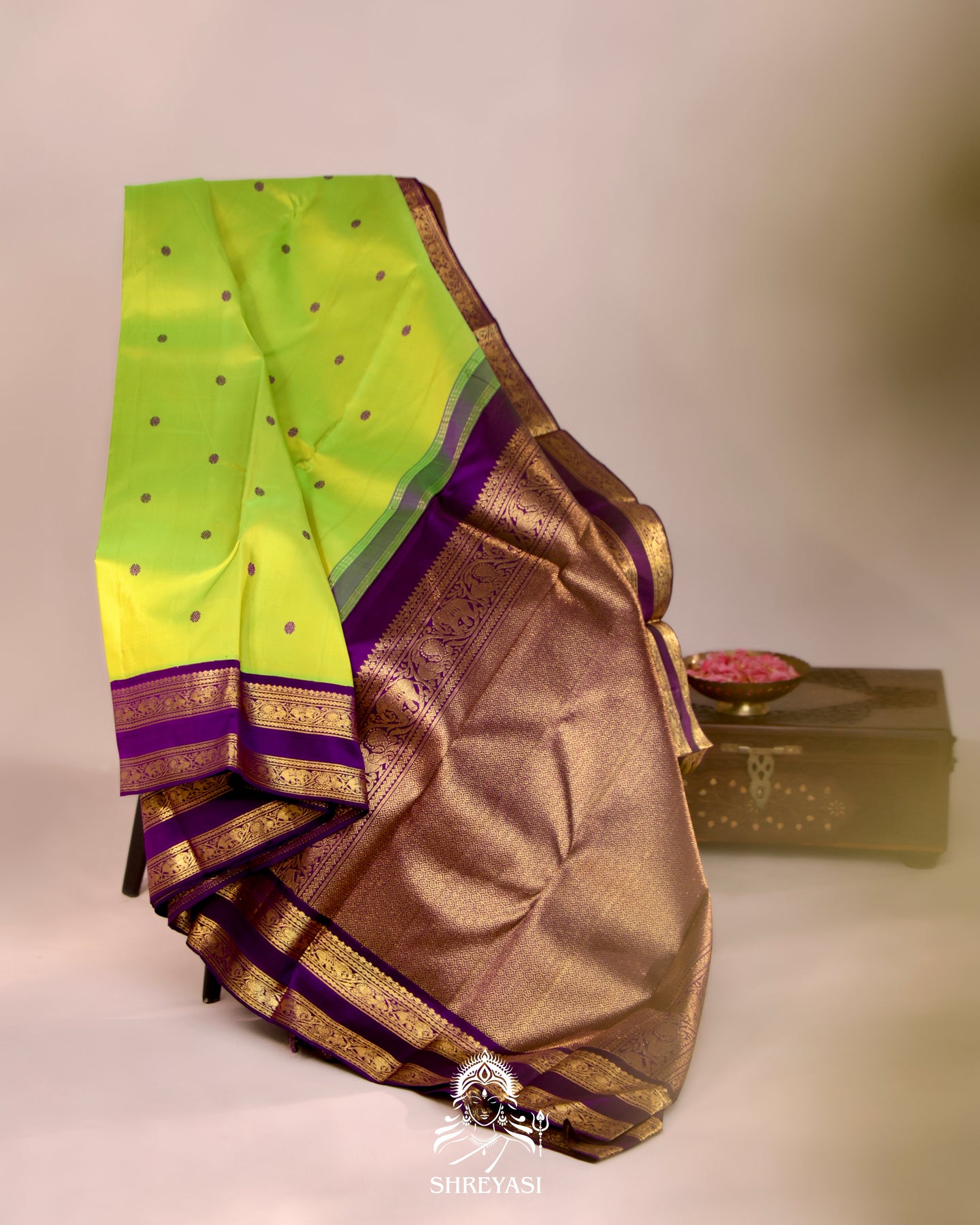 A radiant handloom pure Kanjivaram silk saree woven in a striking lime green body with a deep purple Korvai border. The contrasting shades are joined directly on the loom using the traditional Korvai technique, creating a crisp, intentional transition between colours.