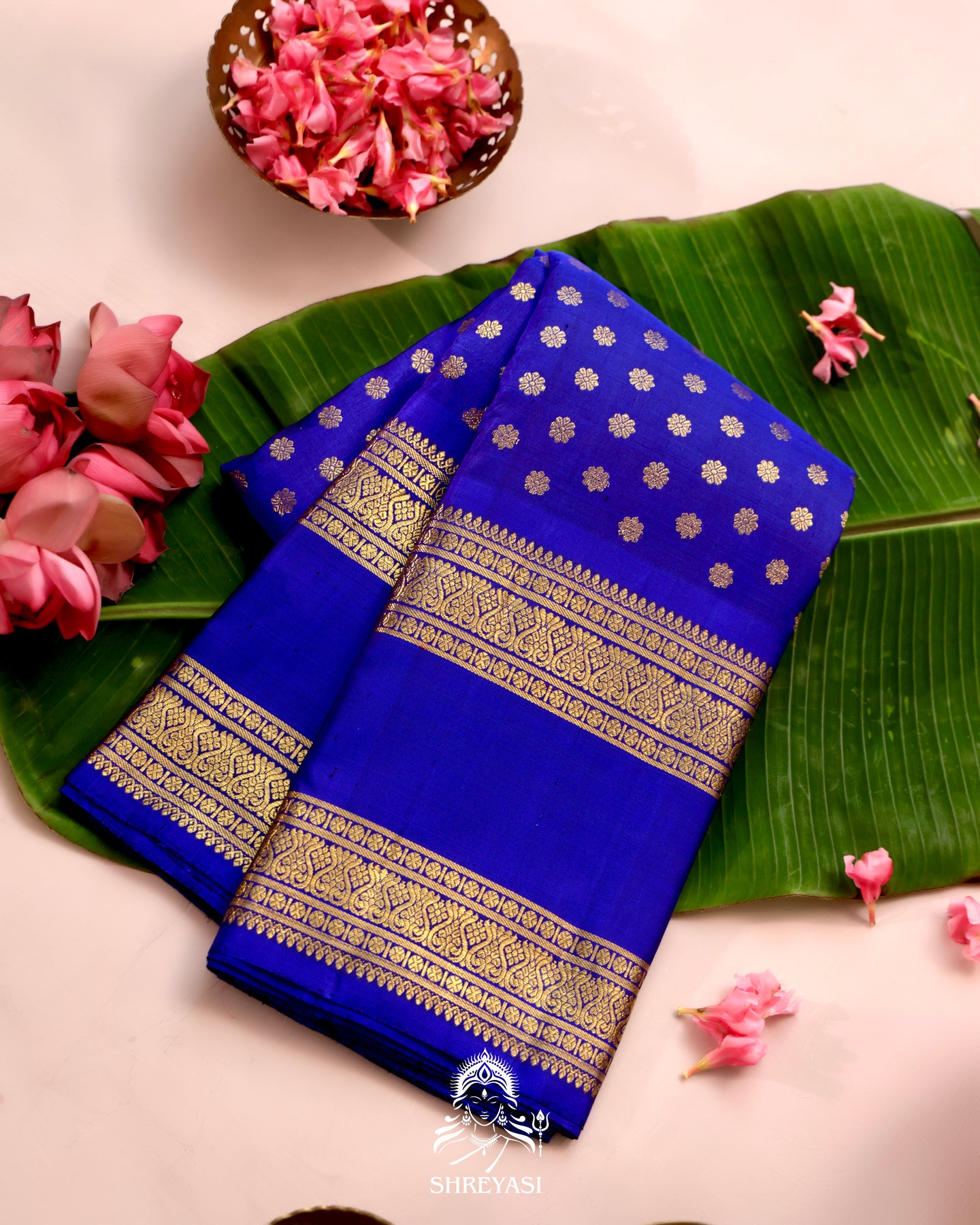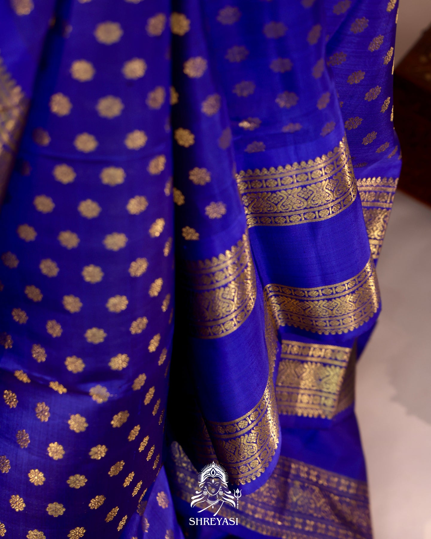 Handloom pure Kanjivaram silk saree in a rich royal blue, woven with real zari for a deep, luminous gold finish. The body features all-over floral buttas created using traditional Korvai weaving, allowing the contrasting body and borders to join seamlessly by hand.