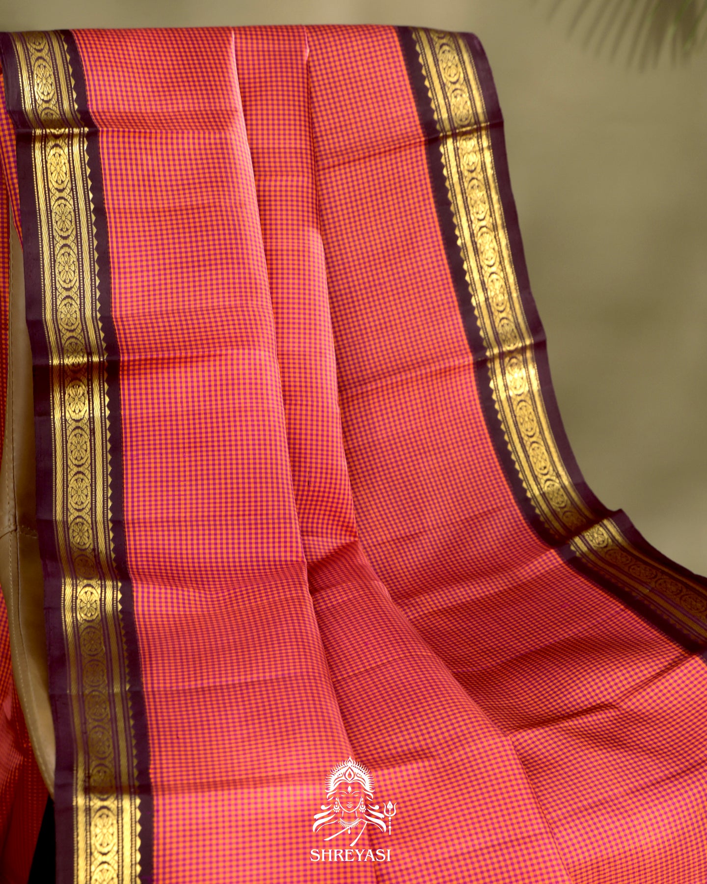The body features a finely woven small kattam check pattern, created through tightly set silk warps and wefts rather than surface design. This siru kattam style is a hallmark of vintage Kanjivaram sarees, prized for its subtle texture, visual depth, and exceptional drape. The checks read clean and balanced, giving the saree structure without heaviness.