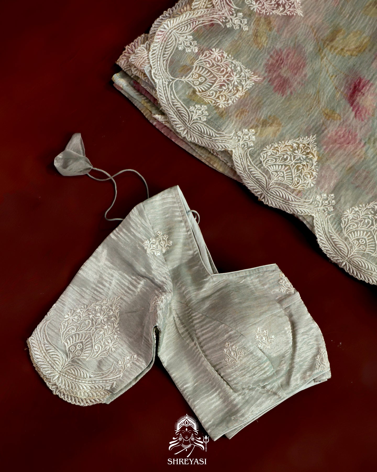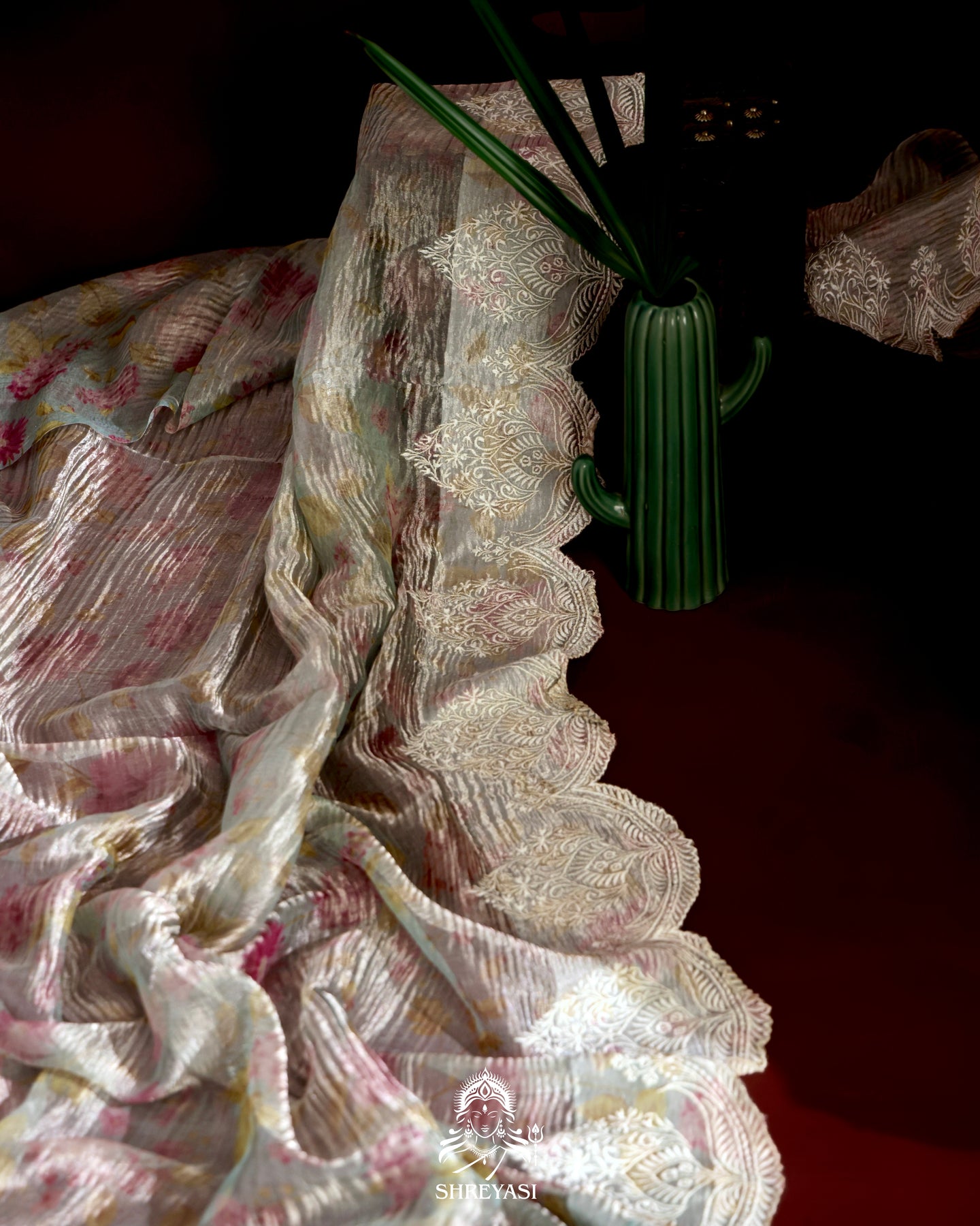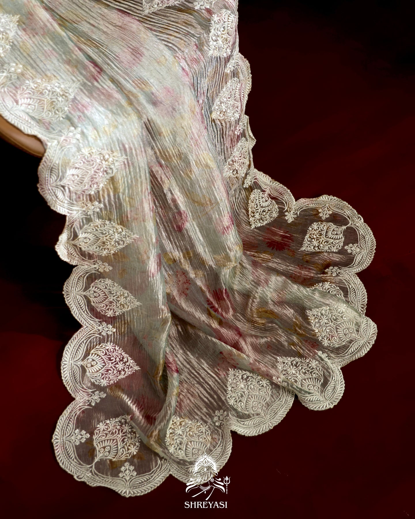 A handloom pure Banarasi crushed ektara tissue saree featuring a soft, luminous sheen and airy drape. Finished with delicate scalloped thread embroidery along the borders, this piece combines Banarasi artistry with modern elegance. Lightweight, festive and flattering on all body types - a timeless statement saree for celebrations, evenings and special occasions.