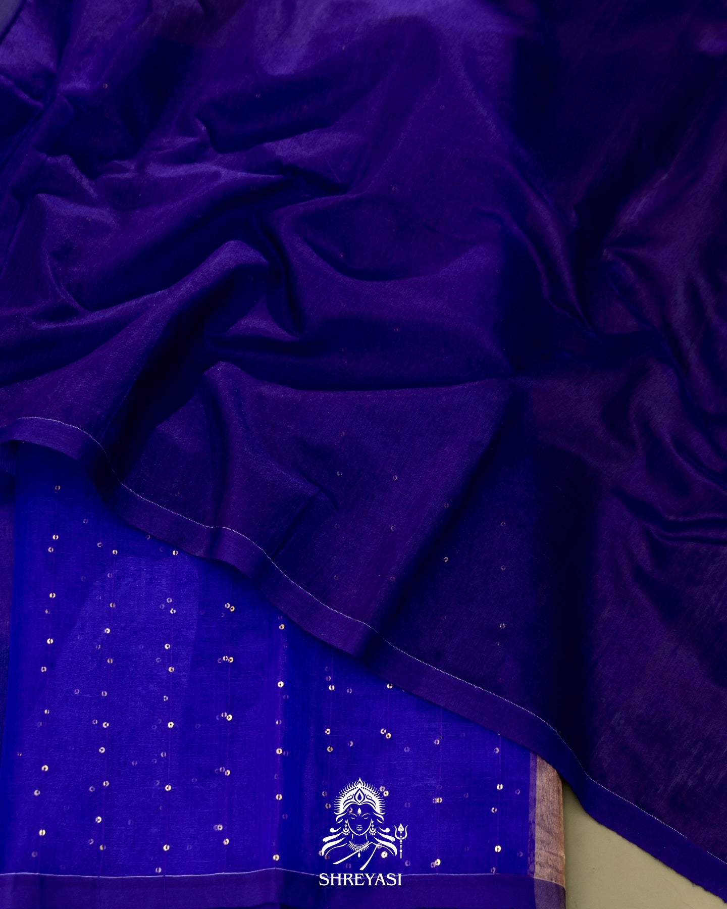 Delicate motifs are created using fine needle-worked jamdani, lending the saree a soft, almost illustrative quality. Micro sequins are scattered sparingly across the body, adding a subtle shimmer that reveals itself only in movement, never overpowering the weave.