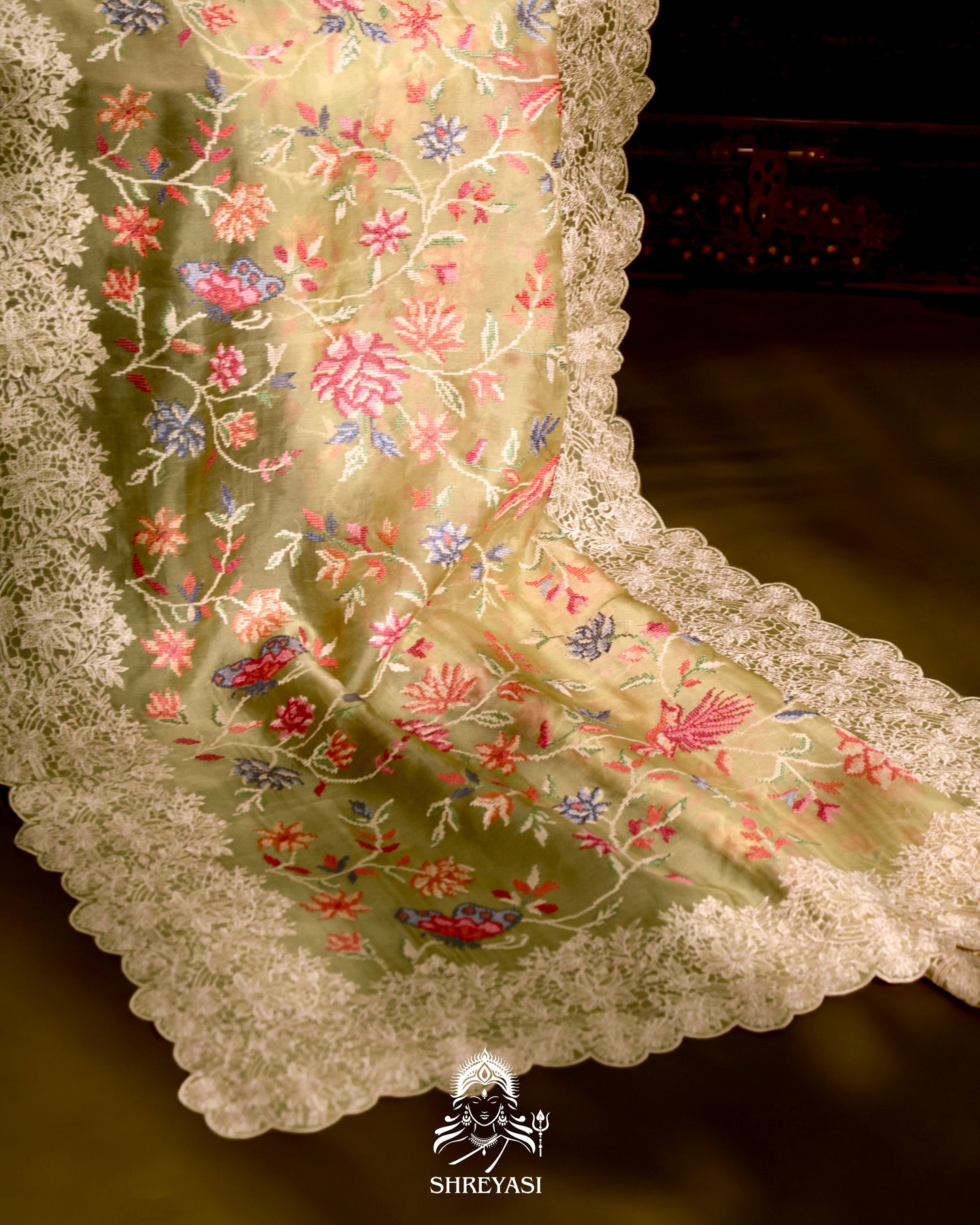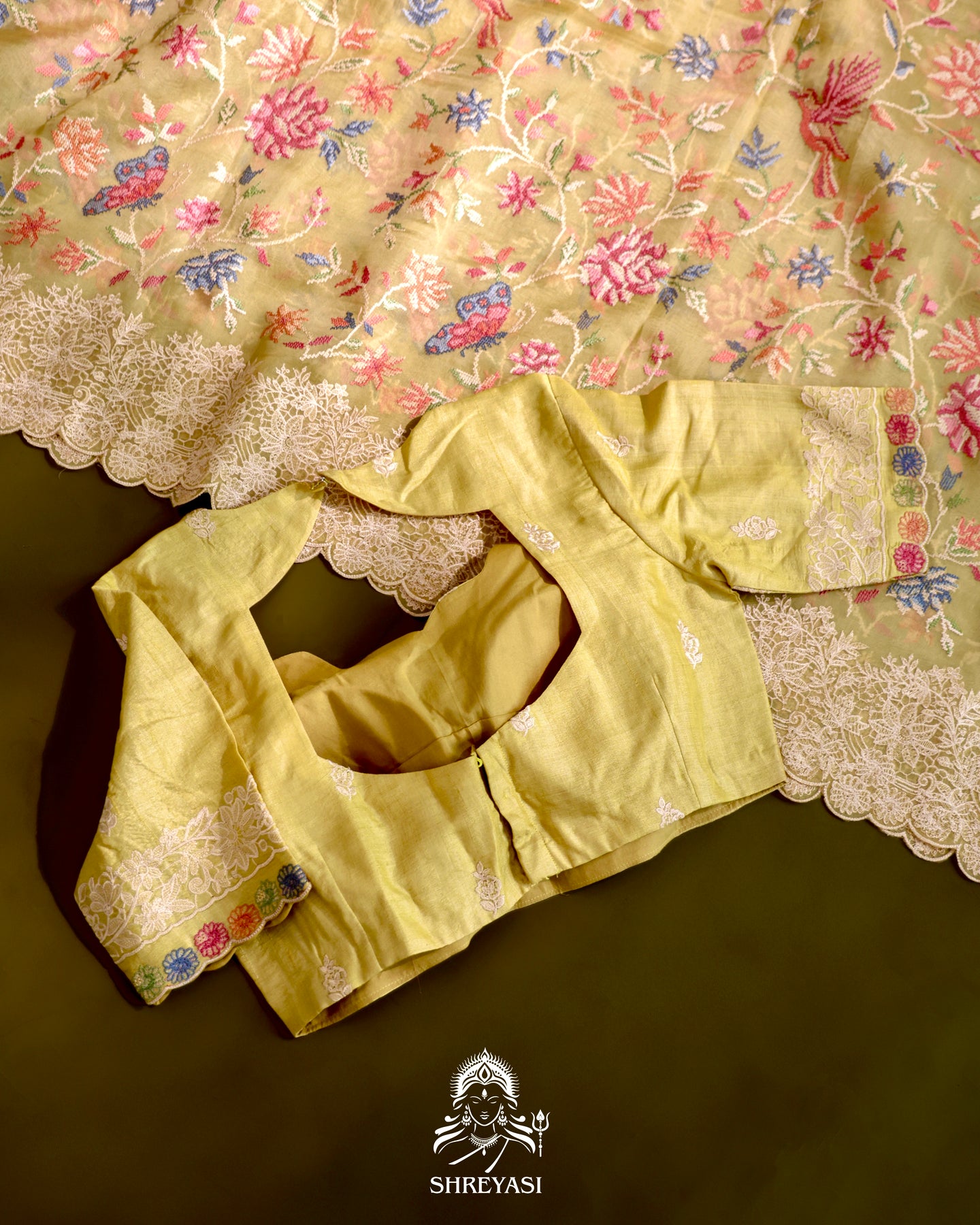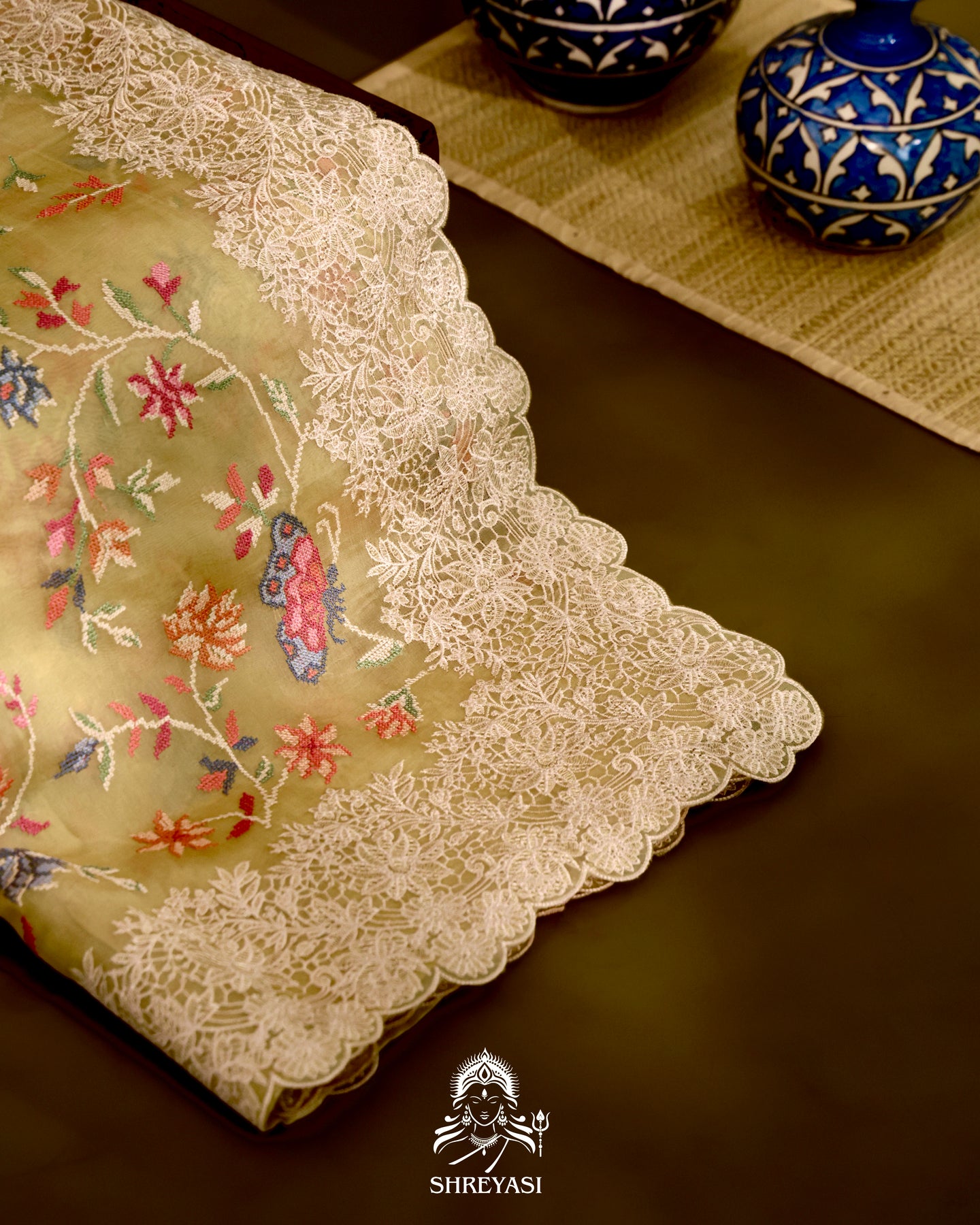 A refined pure organza silk saree showcasing intricate petit point embroidery across the body. Fine floral and bird motifs are rendered in delicate, closely worked stitches that create a soft, tapestry-like surface without weighing down the fabric.