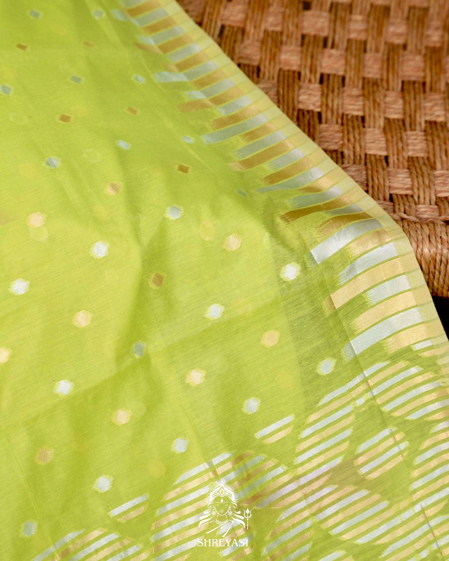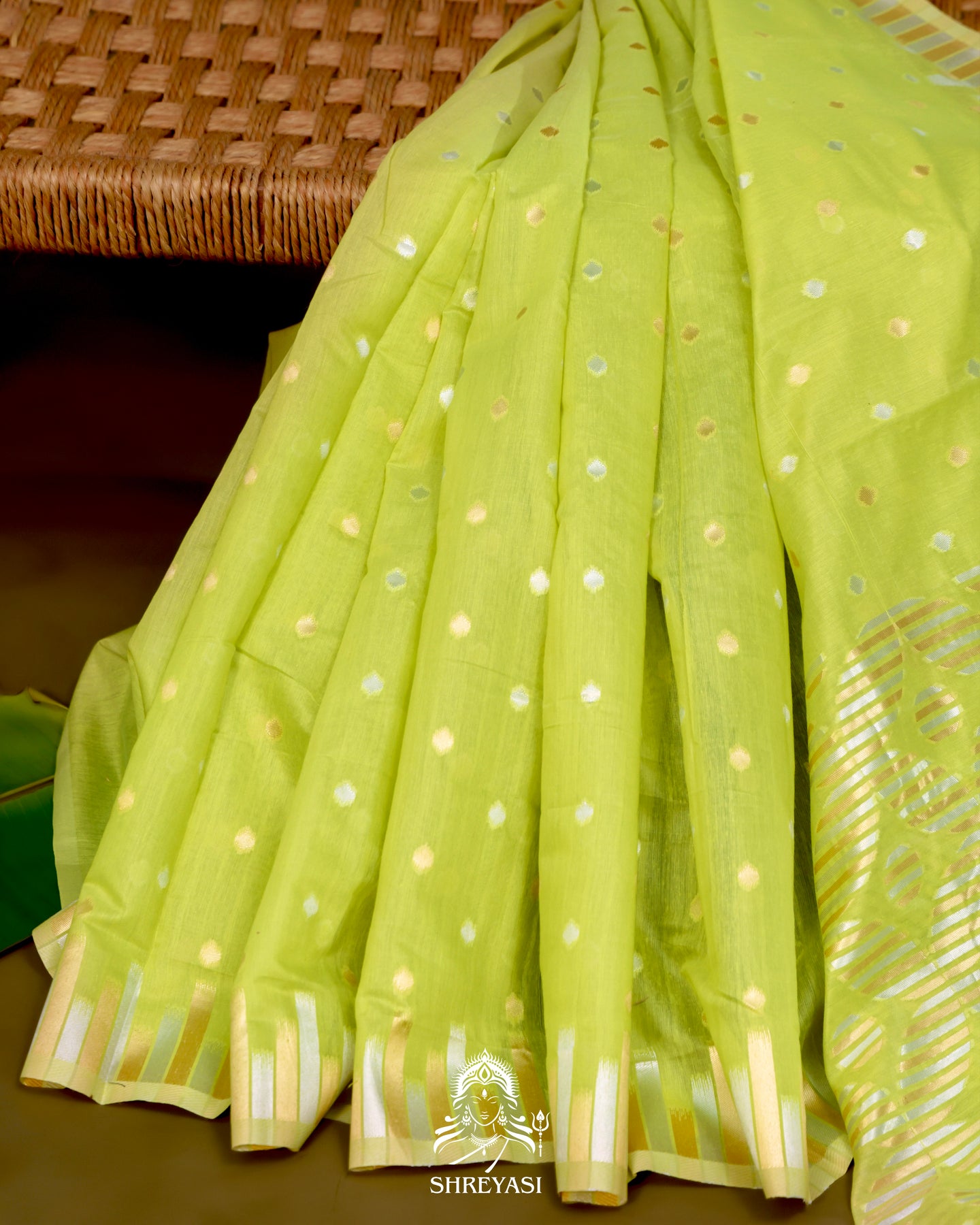 The body features delicate coin bhutas scattered evenly across the weave, adding soft texture and dimension without overpowering the base color. The borders are finished with fine zari stripes that create a clean, structured frame, while the pallu carries coordinated woven detailing for a balanced finish.