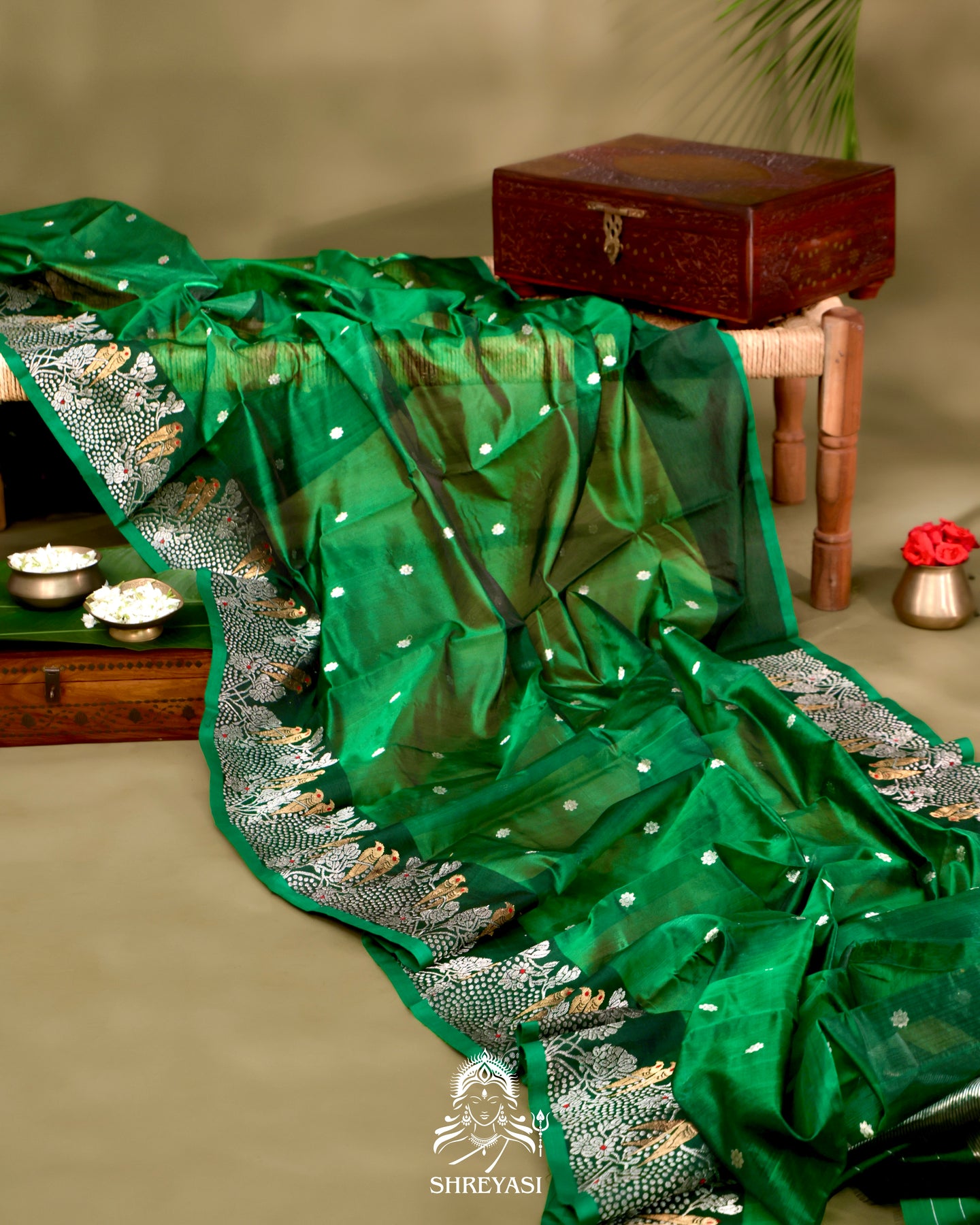 The borders carry the statement. Delicate meenakari birds perched among floral vines, woven with precision and restraint. The detailing is intricate but composed, allowing the motifs to feel intentional rather than ornamental excess.