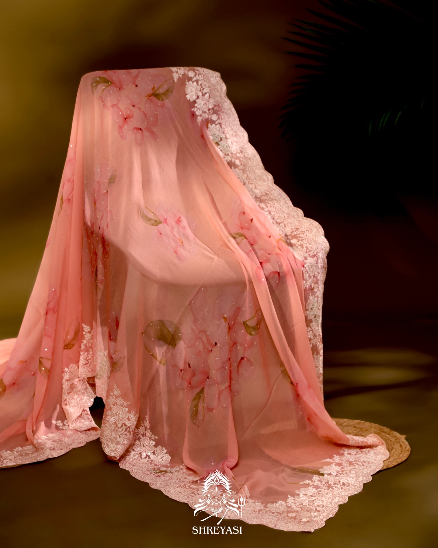Floral Chiffon Georgette Saree with Scalloped Thread Embroidery