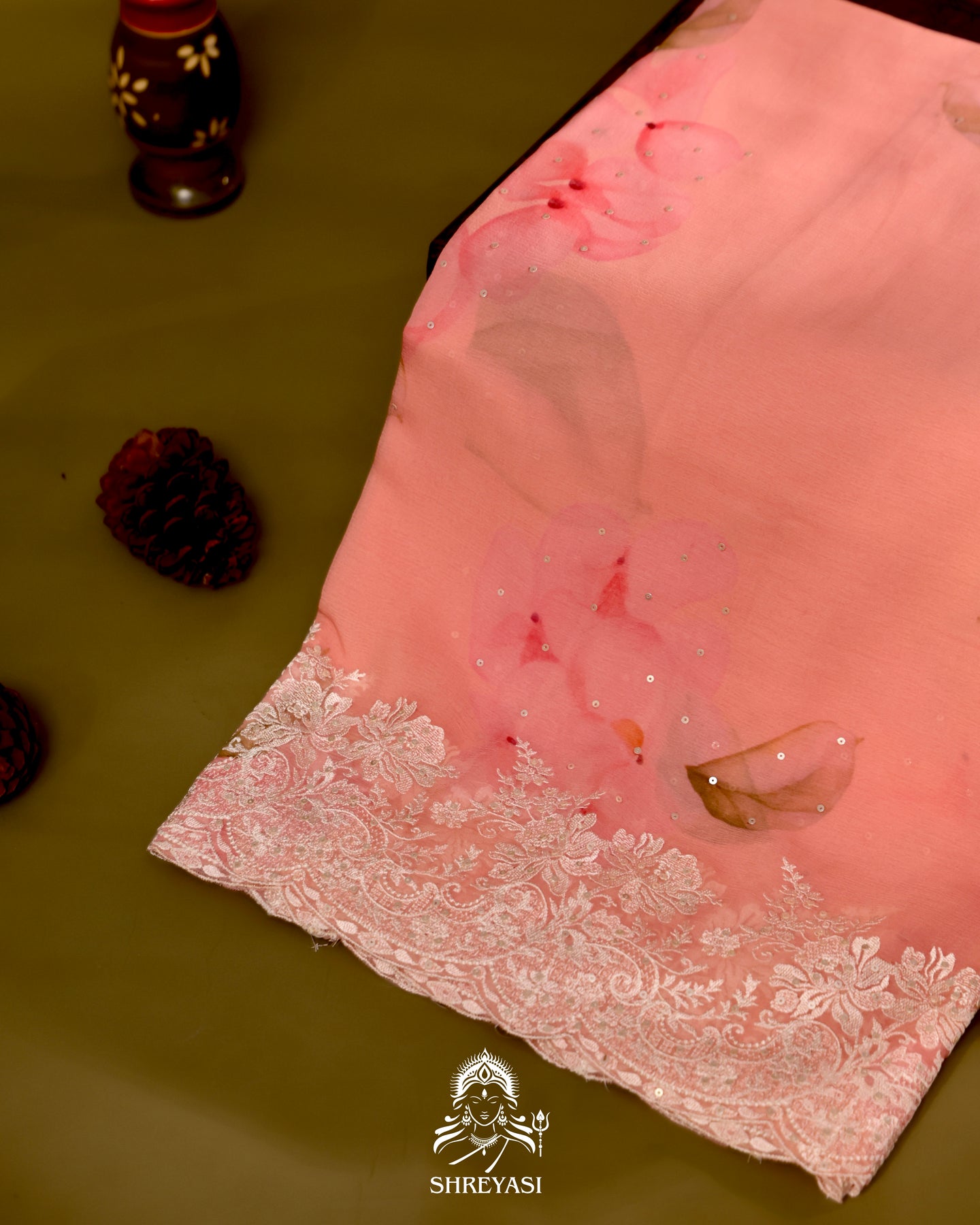 Crafted in pure chiffon georgette, this saree is defined by its soft drape, sheer texture, and effortless movement. The fabric carries a delicate floral print that blends seamlessly into the base, creating a light, airy visual with a fluid fall.