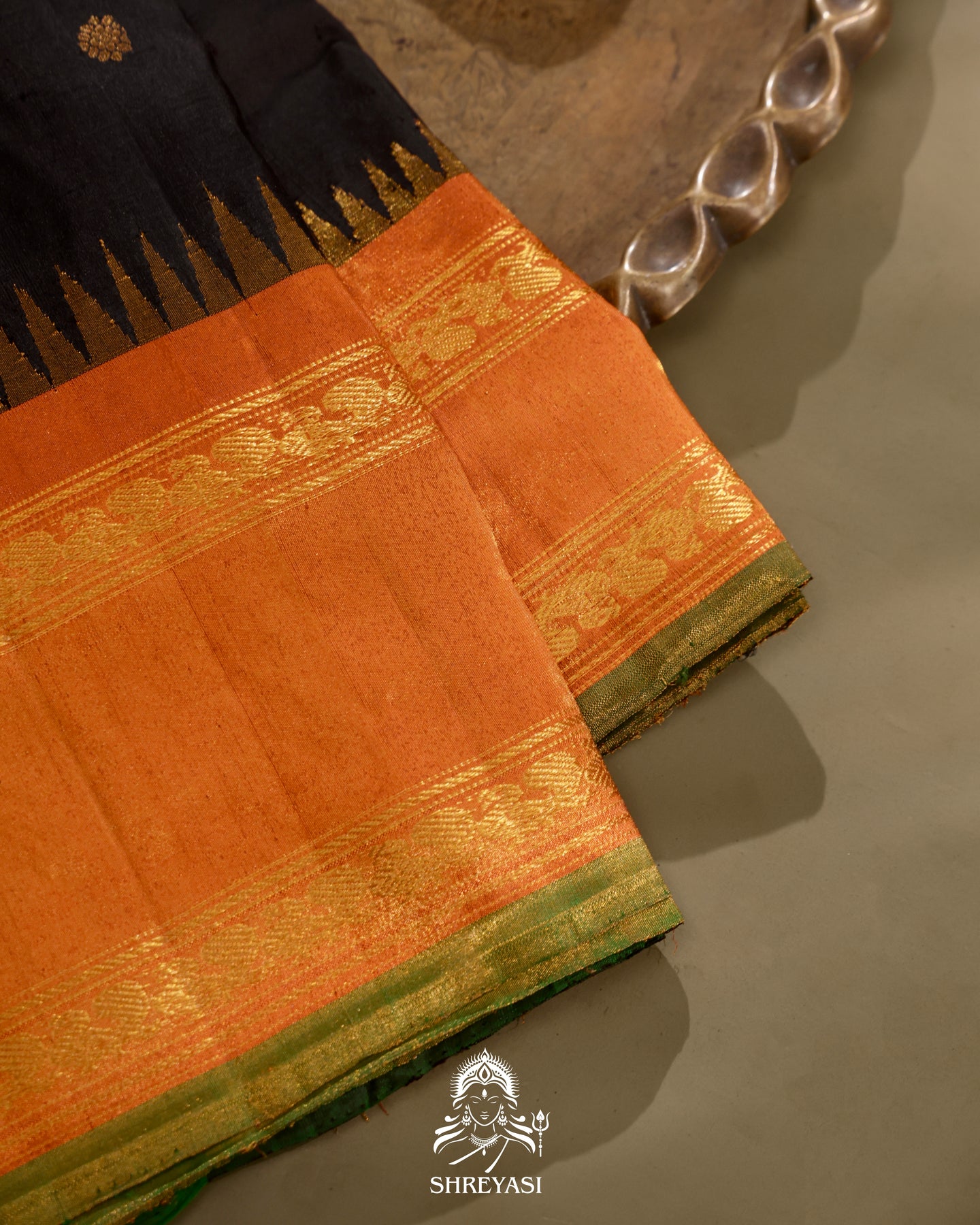 The body is woven in fine silk in a deep black tone, punctuated with subtle buttas that add quiet rhythm without overpowering the weave. The border and pallu are crafted in luminous tissue silk, brought together using traditional kuttu korvai weaving, a technique where the border and body are woven separately and interlocked with precision on the loom.