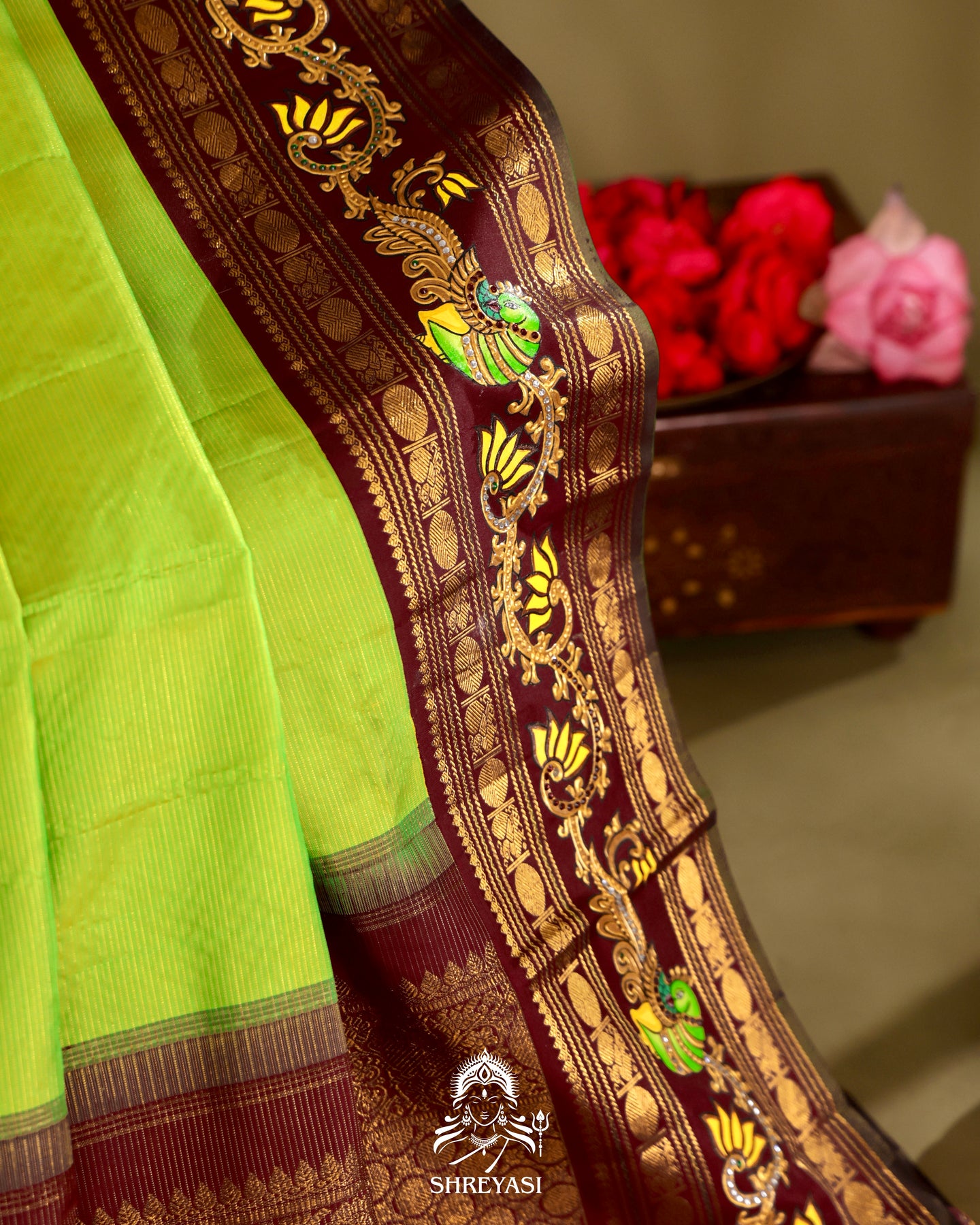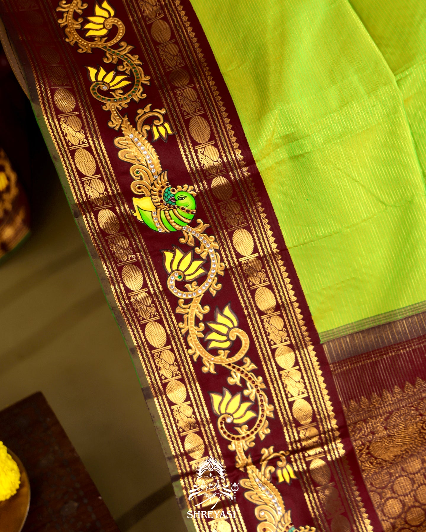 The borders are where tradition steps forward. Deep maroon frames, detailed with traditional Tanjore-style artwork. Hand-painted motifs that move between lotus forms and stylised birds, layered with gold, green, and delicate highlights that catch the light without shouting for it.