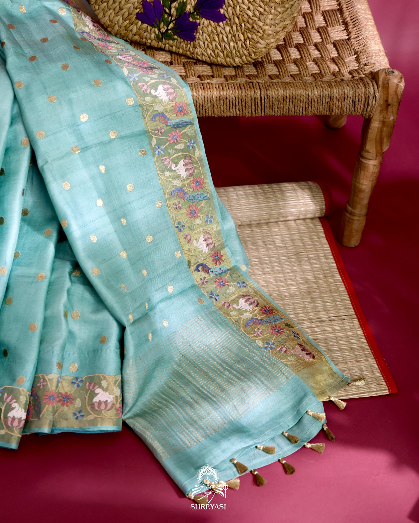 Handloom pure tussar silk saree in a refreshing aqua blue, finished with a naturally soft sheen and a fluid, breathable drape. The body is dotted with delicate antique gold buttas that add quiet shimmer without disturbing the serenity of the colour.