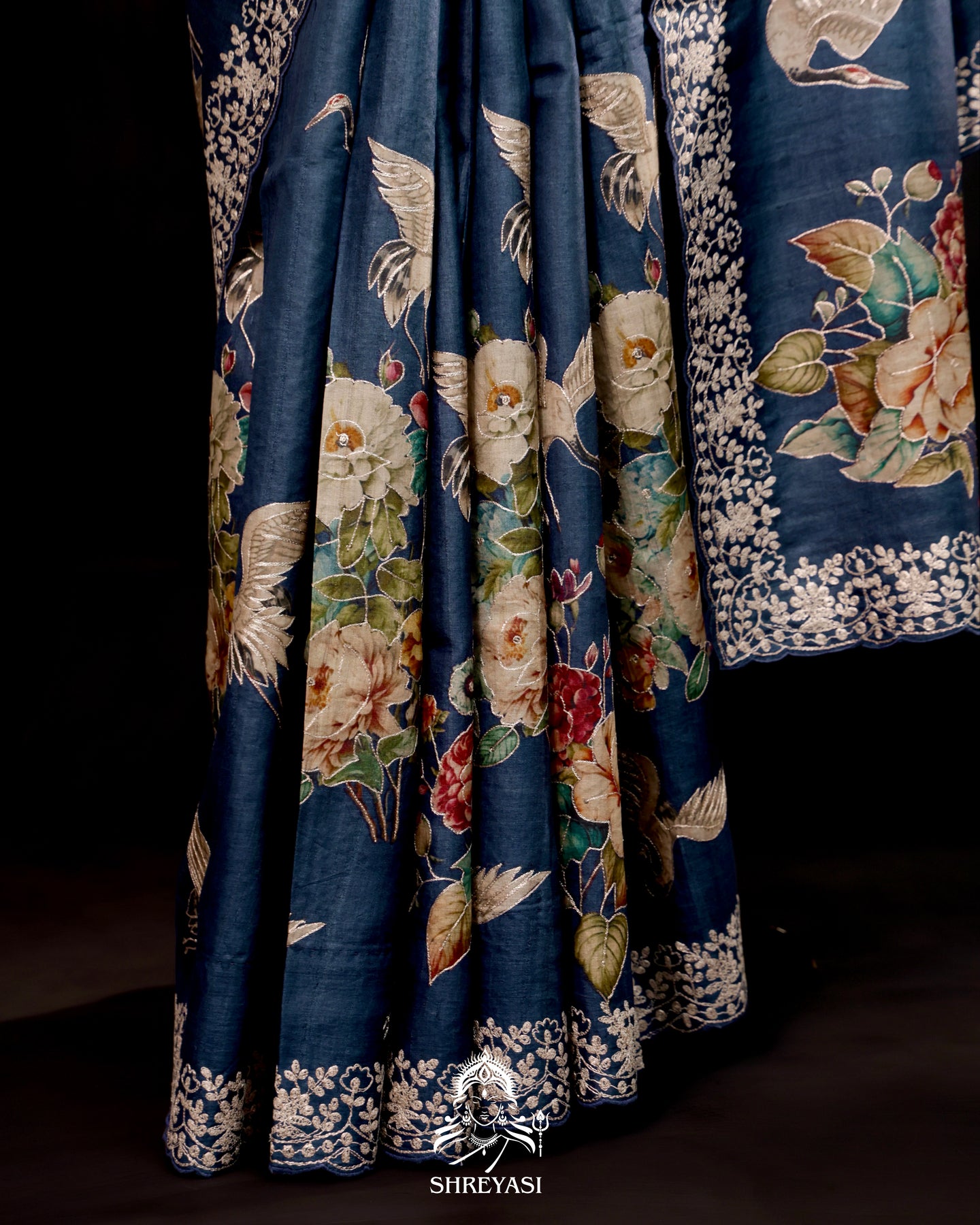 Delicate aari pita embroidery highlights the borders and pallu with floral and bird motifs, adding subtle definition and depth without overwhelming the fabric.