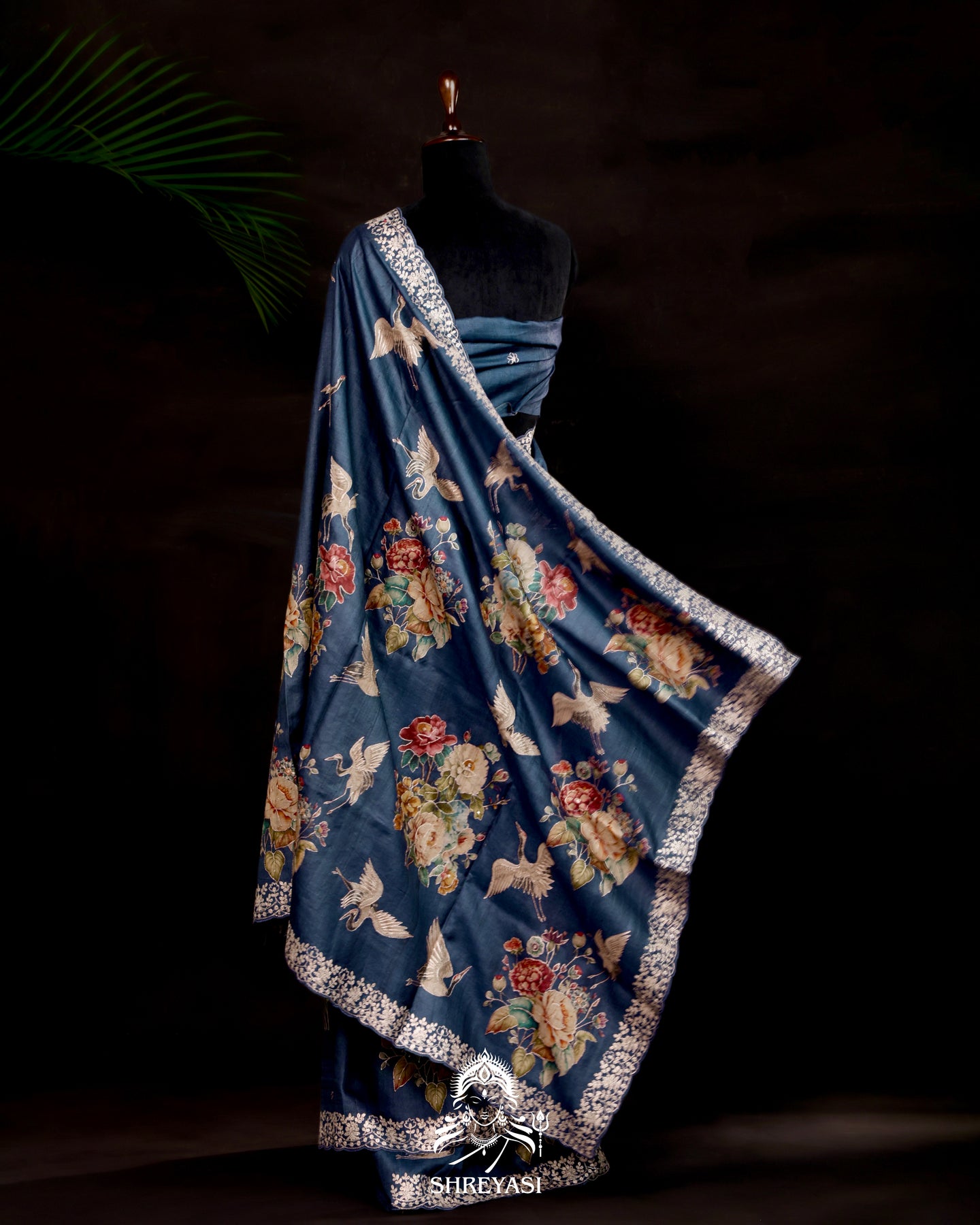 Handloom Banarasi saree woven in pure tussar silk, finished in a deep sapphire tone with digital floral prints flowing across the body. The natural texture of tussar silk gives the saree a soft matte finish while allowing the prints to appear airy and well balanced.